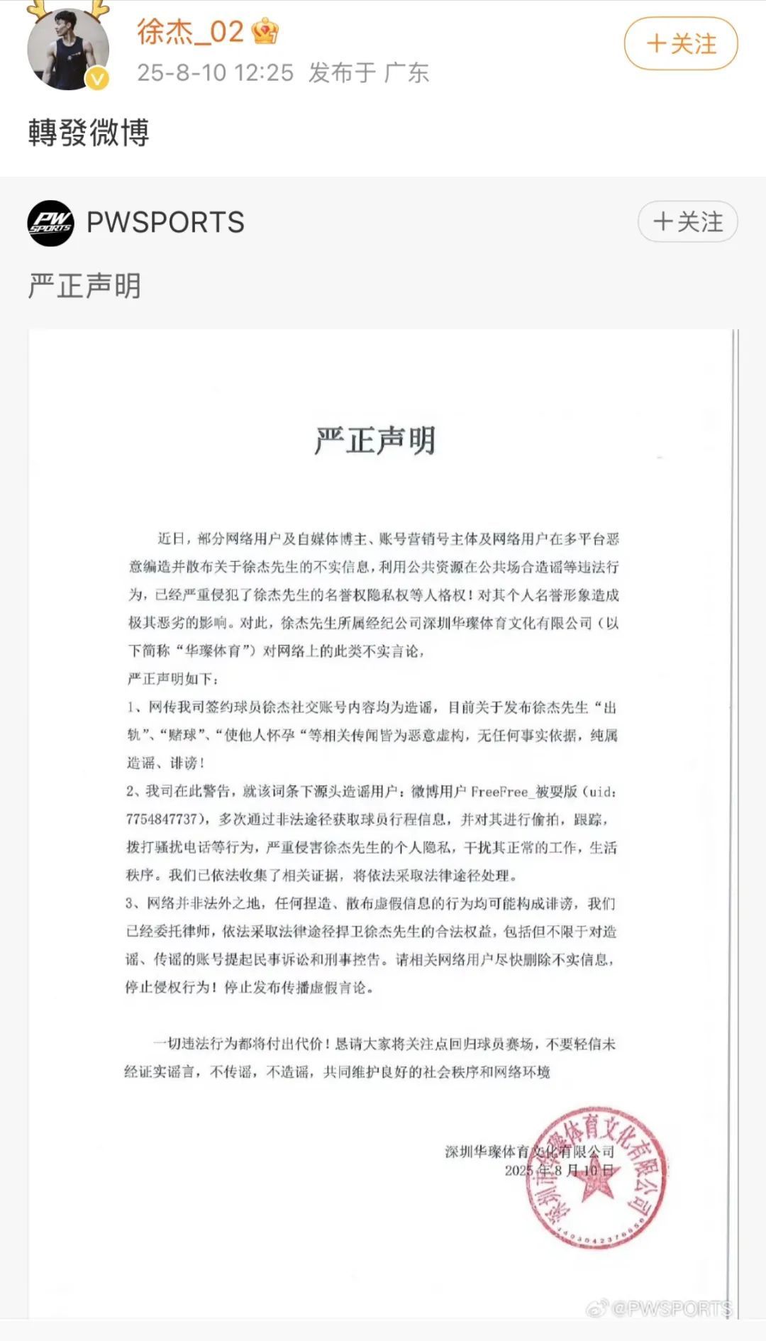 8月10日,徐杰经纪公司pwsports发布严正声明,具体实质如下:
